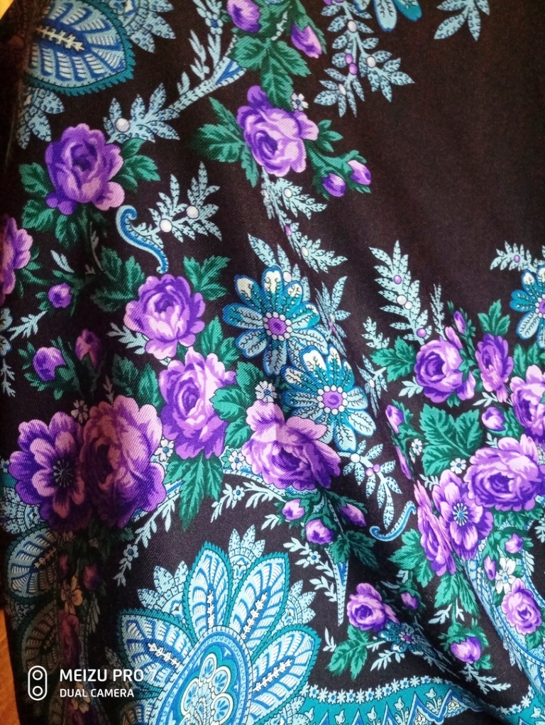 Продолжу, давно мечтала и наконец купила платок Черные глаза - 14. Красив по своему, самое большое на меня впечатление производят гирлянды из затемненных роз, будто бы из-под воды, по краю платка, ну и само собой красная смородина веточками. Но это для любования. На мне, и в гардеробе Черные глаза сильно проигрывает Цветочному вееру, как-то похож на "бабушкин" из сундука. Решила для себя - буду покупать современное, и осеклась - ведь ЦВ восстановленный рисунок. Но может быть дело в колористическом решении, качестве ткани? Магия. Для сравнения делала фото, но ЧГ вообще не дается на мой телефон, желтит, теряет красоту.
