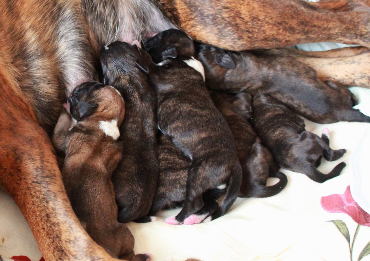 У нас опять двадцать пять пополнение ) Тильда 30 октября родила 8 щенков (плановая вязка питомника) . Один рыжий, одна белая девица и остальные тигровые : 3 парня и 5 девчонок) Теперь нянчимся :)