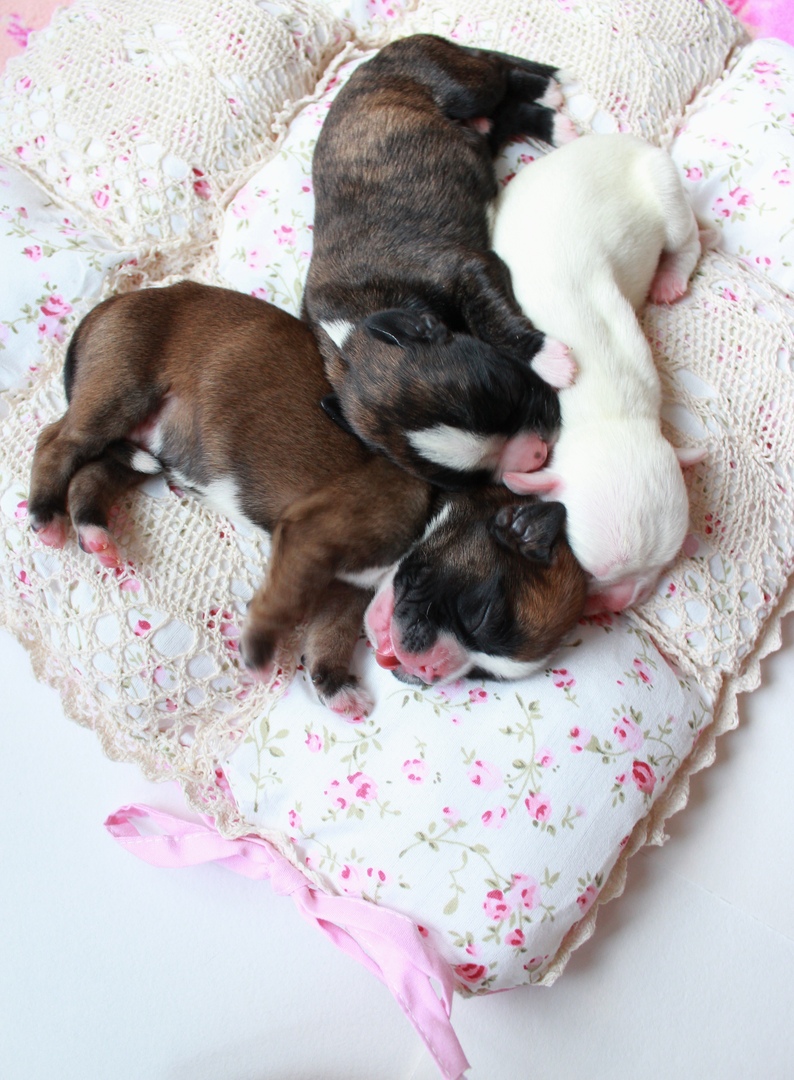 У нас опять двадцать пять пополнение ) Тильда 30 октября родила 8 щенков (плановая вязка питомника) . Один рыжий, одна белая девица и остальные тигровые : 3 парня и 5 девчонок) Теперь нянчимся :)