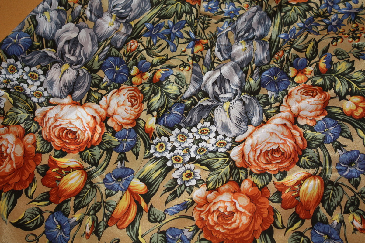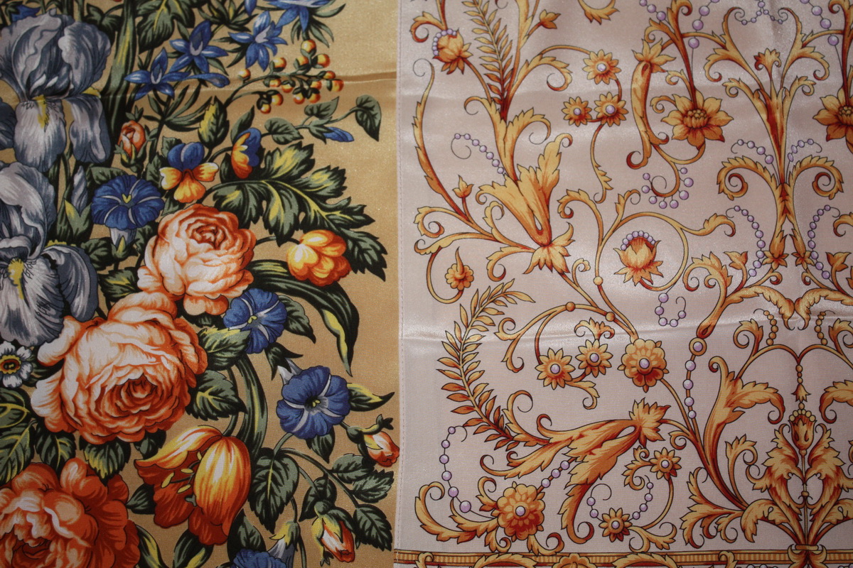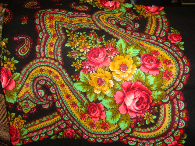 Знаете, у меня тоже был такой платок - Разводной 0. Аляповатый, излишне яркий, без бахромы. Взяла его на дачу, так как было тоже не жалко, куталась сама, а иногда и собак, цеплялись к нему репьи, мок он под дождём. А потом как стукнуло: "Красотища-то какая!"