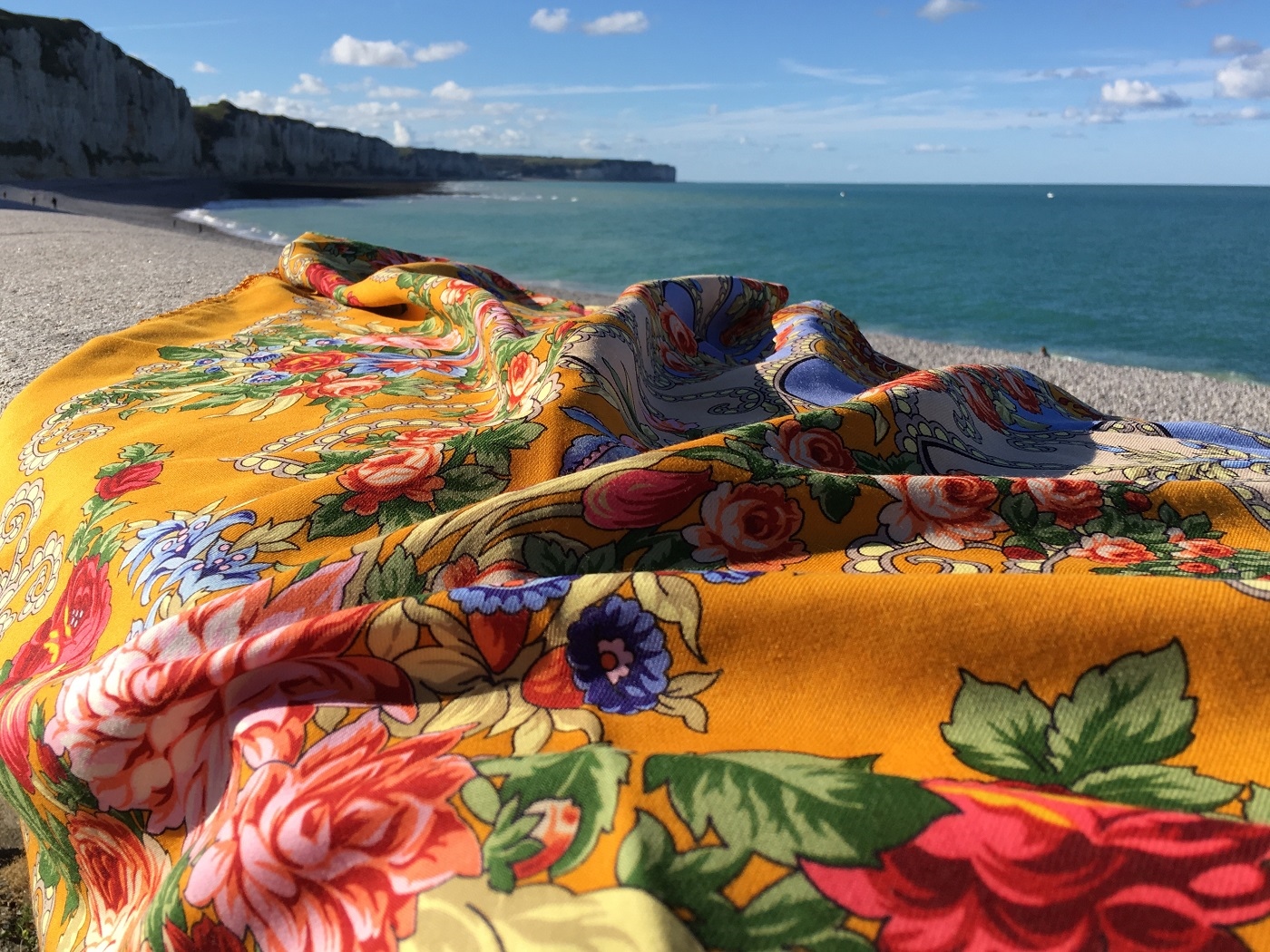 Прислали мне фотоотчет о поездке на выходные, наверное, чтоб убедилась, что подарок пришелся ко двору. Шаль носилась в хвост и в гриву – дочка надевала поверх шерстяной куртки в крупную клетку в цветах шали, с голубым джинсами и кирпичными ботинками, накрывала самого мелкого в коляске, привязывала его к себе, когда гуляли по обрывам.