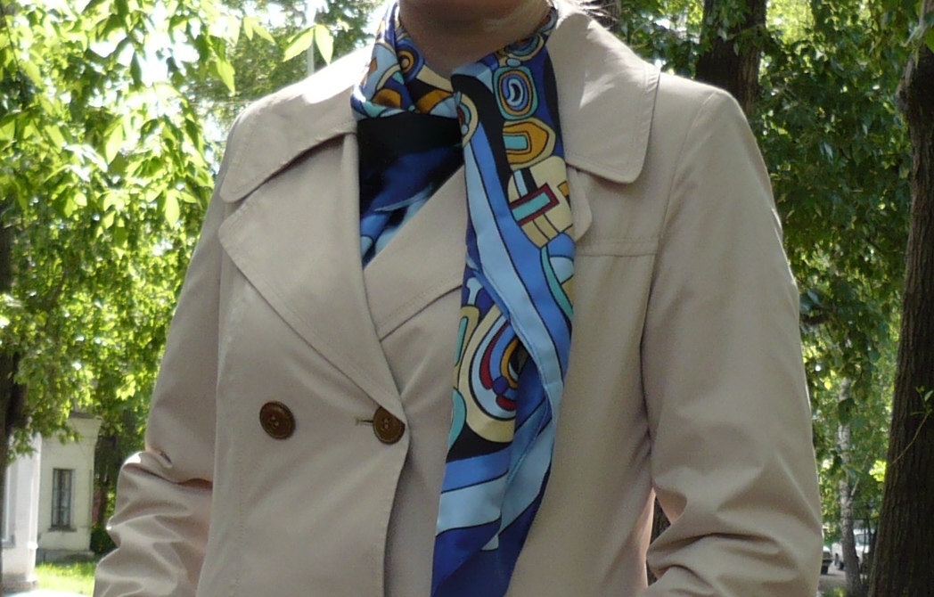 Gerda, а у меня платочек "Солнечный город" в, скажем так - сиренево -фиолетово-оранжевом, исполнении. Ношу его с тренчем серо-стального цвета, очень освежает.Вам такой синий цвет очень идет.
