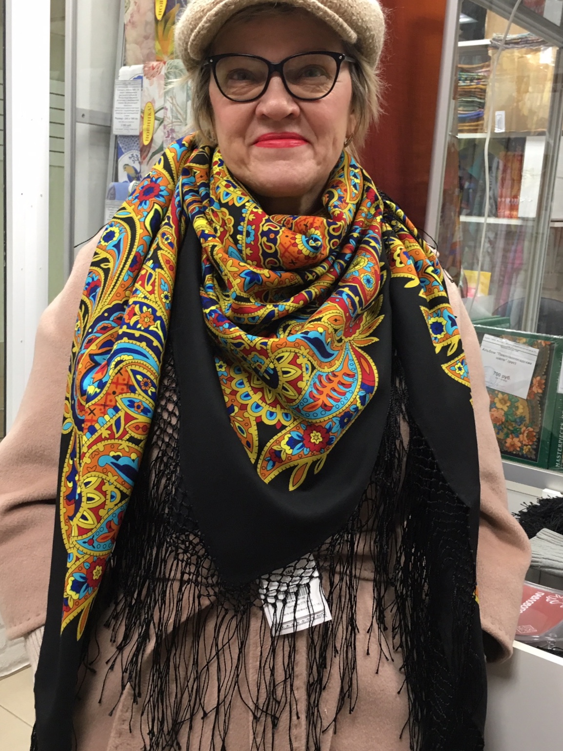Шахтуш, ^% ой, и туфли серые козырные королева сбросила :) . Шикарный ансамбль с красными бархатными брюками получился. А этот колорит шали, несмотря на её название, и правда очень неплохо у новогодней ёлочки смотреться будет.
