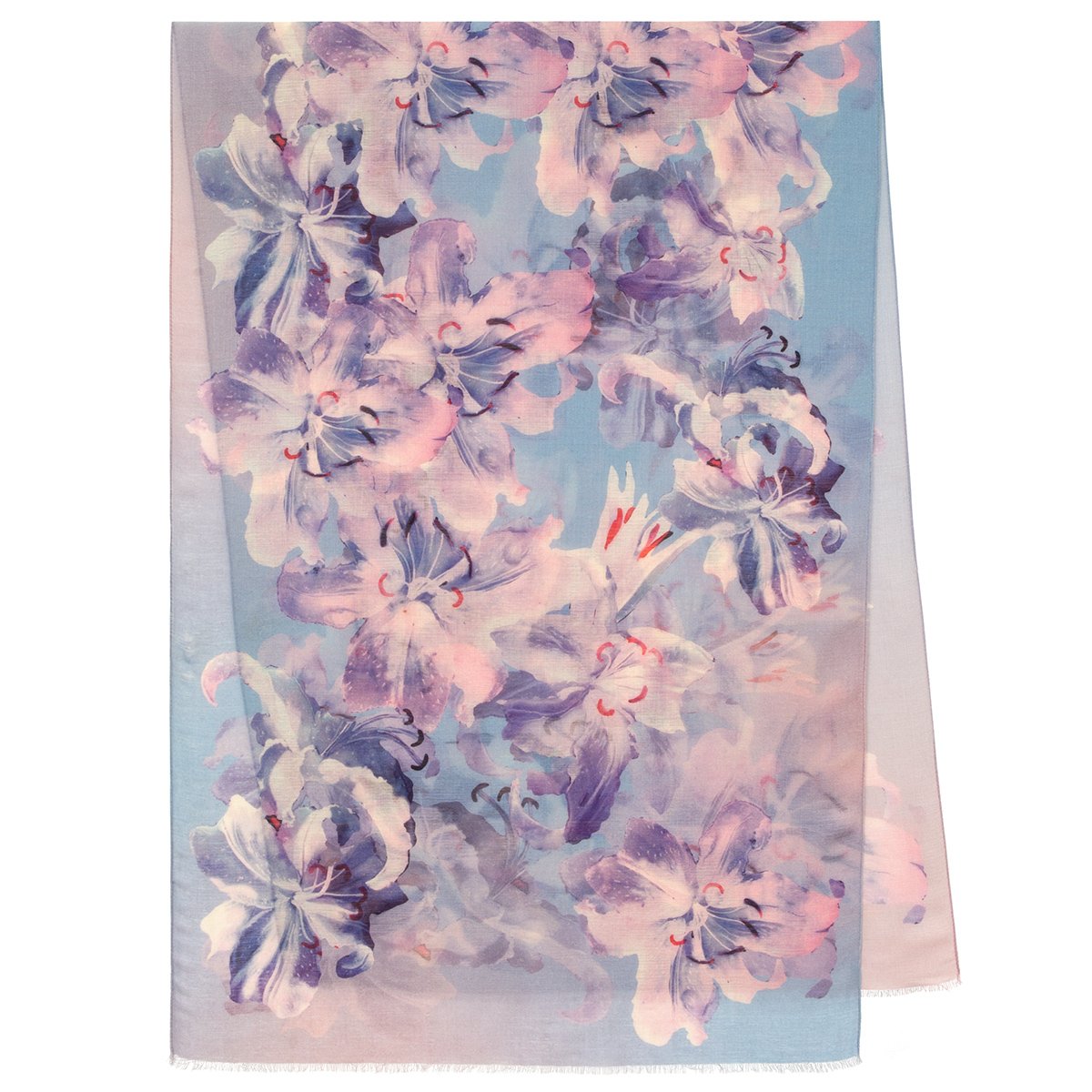 Палантин шерстяной набивной, 80х230 см. Палантины из легкой сильно разреженной ткани. По длинной стороне оформлены подрубкой со швом типа "зиг-заг" или осыпкой с перевивкой кромки, по короткой - осыпкой.