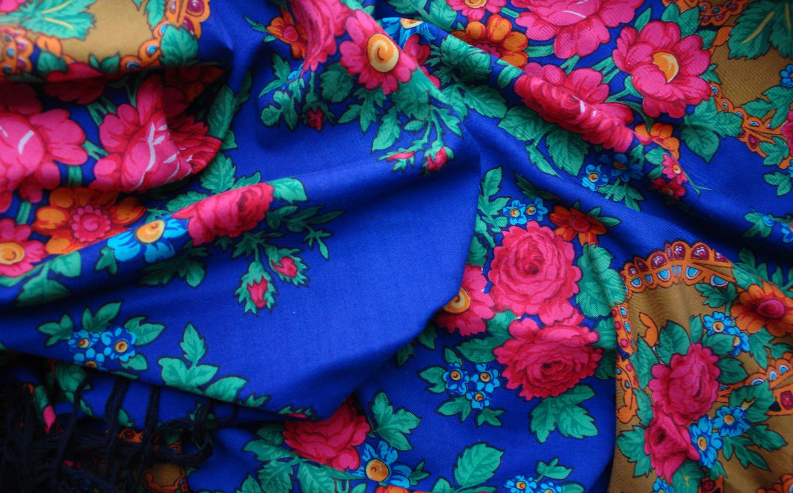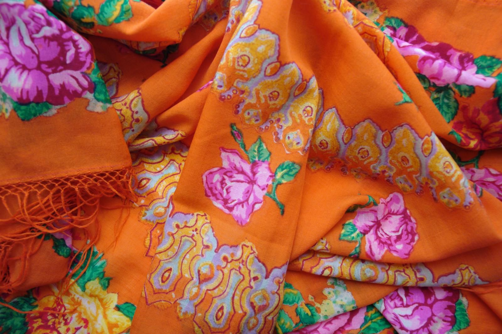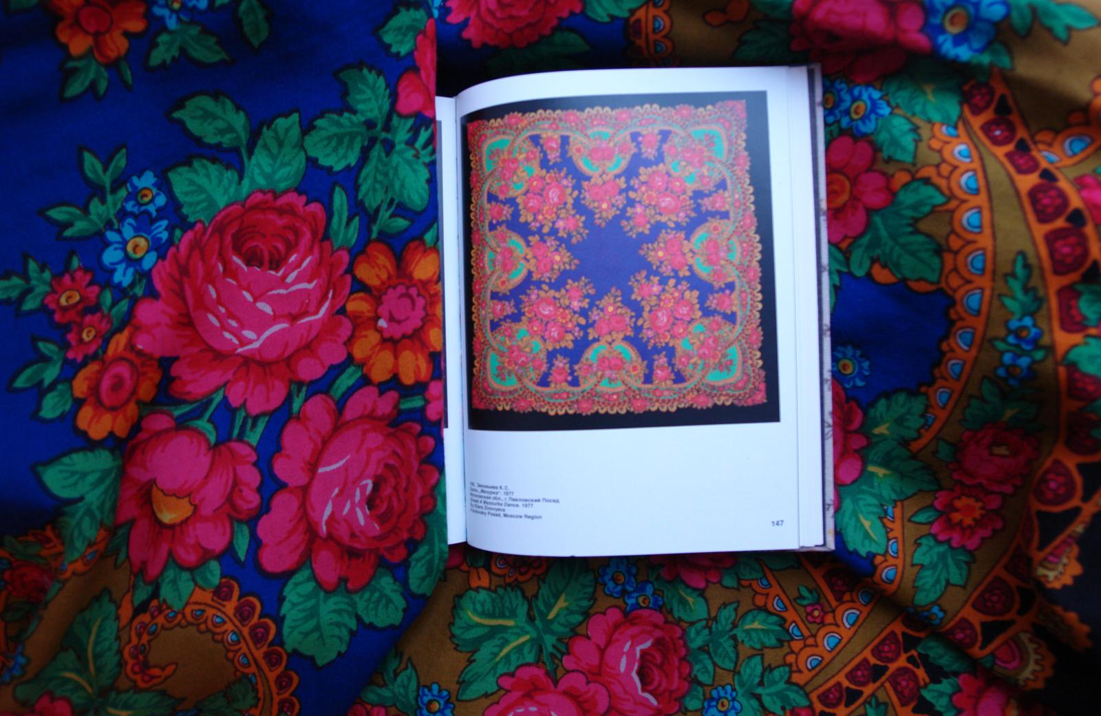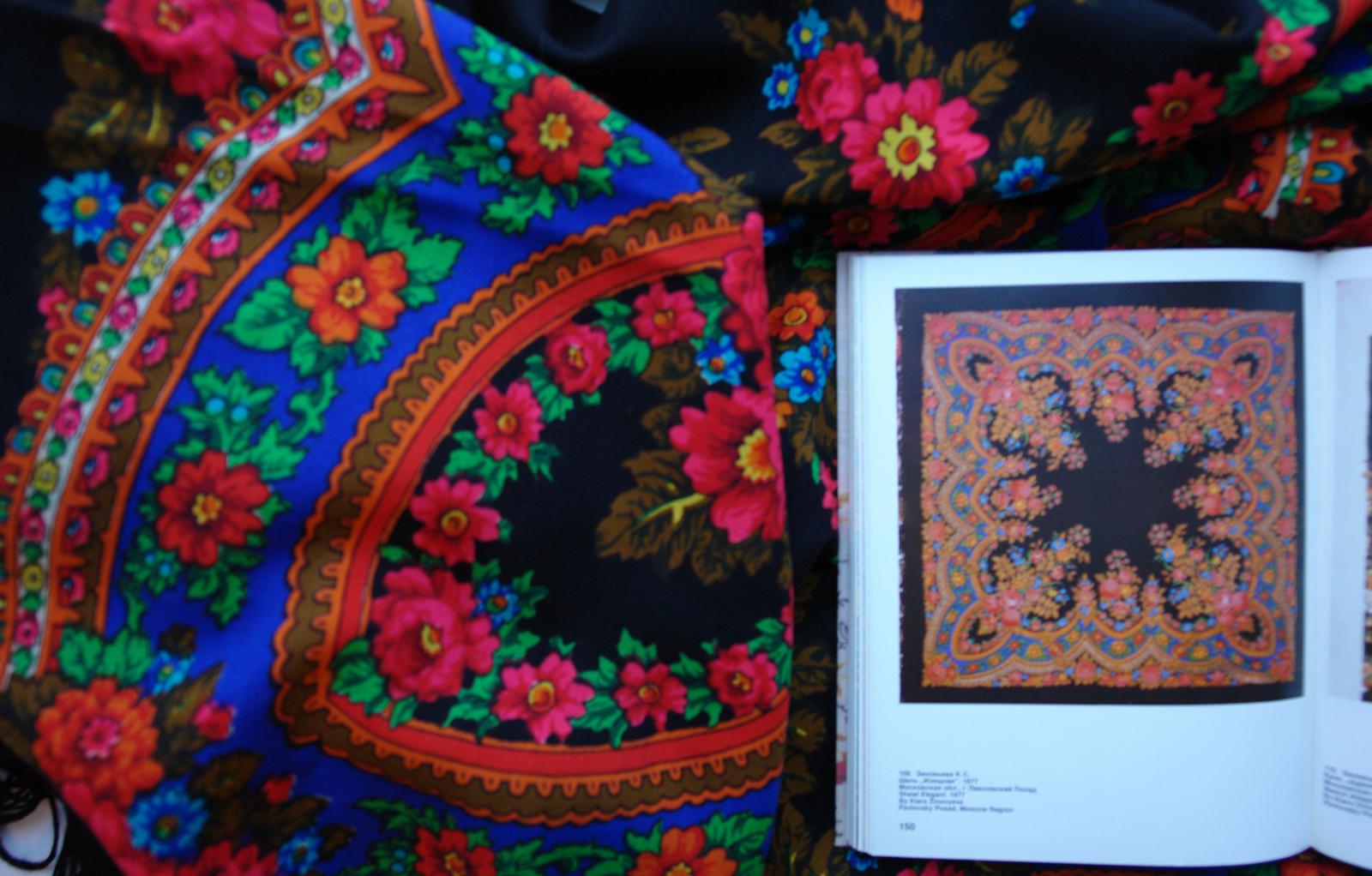 Так как БЕЛЫЕ РОЗЫ ручной набойки в настоящий момент ещё не найдены, то проиллюстрировать страничку из Н.Г. Рудина захотелось с помощью другой оранжевой шали ручной набойки авторства Лидии Шаховской