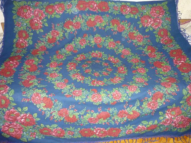 Платок Павлопосадский розы на чёрном! Не сомневайтесь, у меня такой был куплен в 1980 году, сейчас у сестры, кстати очень интересный, в те годы это была бомба, продавалась в отделах сувениров, пройти мимо было невозможно! Я даже стоимость её помню, 84 рубля. Надеюсь убедительно написала!