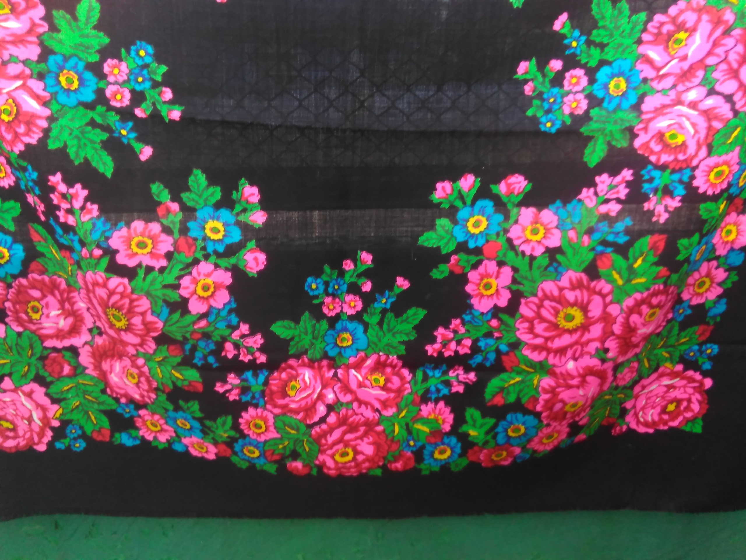 Пересмотрела все ссылки, у меня на платке на черном фоне угловой рисунок верхняя часть один цветочек голубой и два розовых немножко ниже. Такая расцветка только в "колорит 7" фон красный.