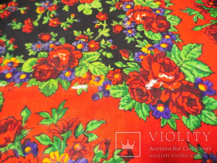 Хоть платок и не в самом лучшем состоянии, но он, имхо, интересен - тем, сколько было разных подходов к "Русскому узору", попыток передать металлическое ожерелье и цветы. Причем, платки эти печаталась в самых разных размерах, в том числе, и в небольших. Не умею стаскивать фотографии, но вот где живет этот платок: https://www.ebay.com/itm/1950s-VINTAGE- ... rk:45:pf:0