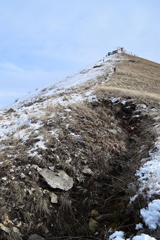 Дорога лежит сначала через теплую лесную зону, потом через пронизываемые ветром и покрытые льдом склоны. На самой вершине восходителей встречает икона. Мне эстетически не нравится ее соседство с кустарной постройкой технического назначения, поэтому не буду и показывать вблизи. На горизонте виден Кавказский хребет. Под облаками - это Пятигорск.