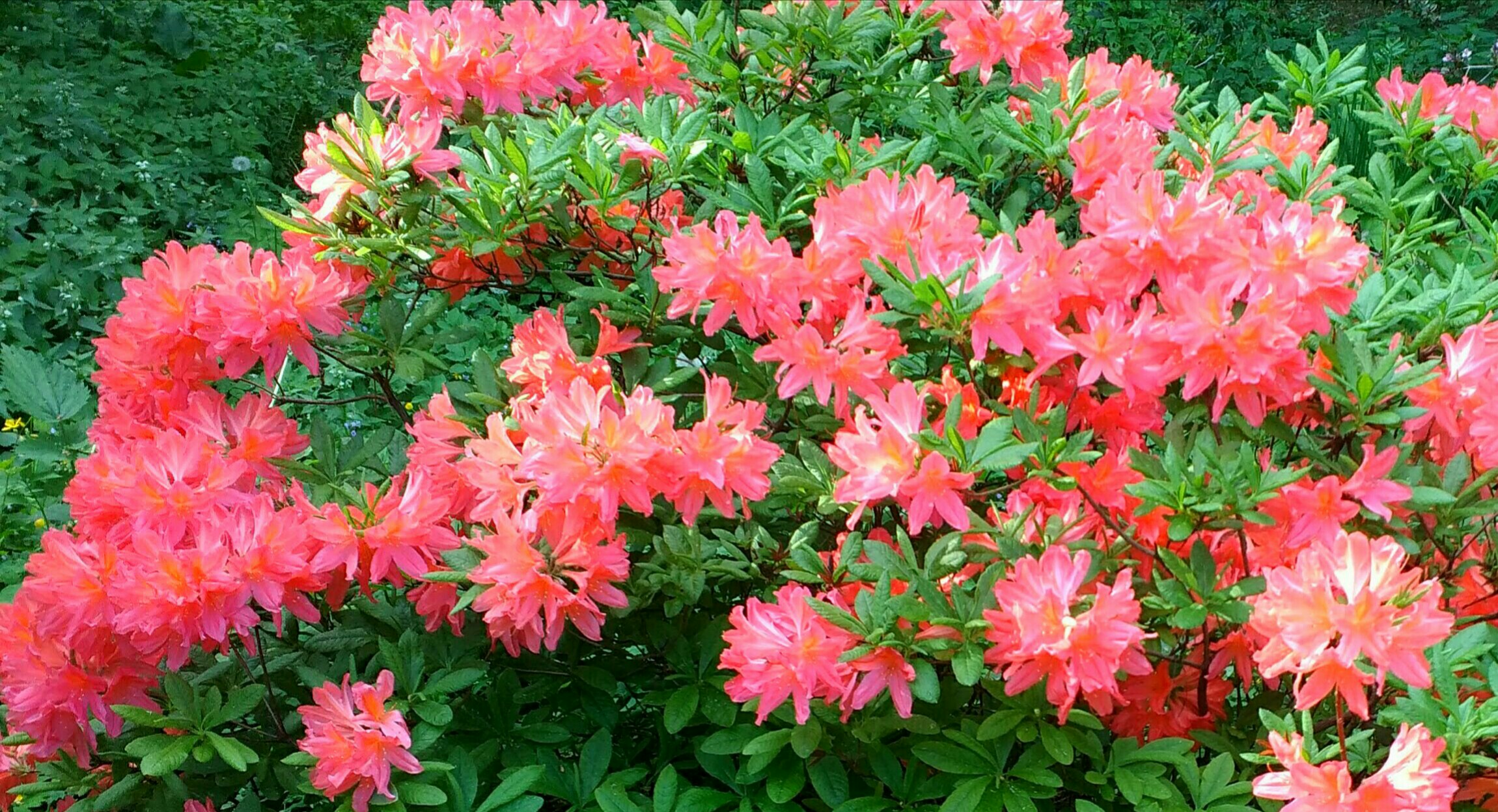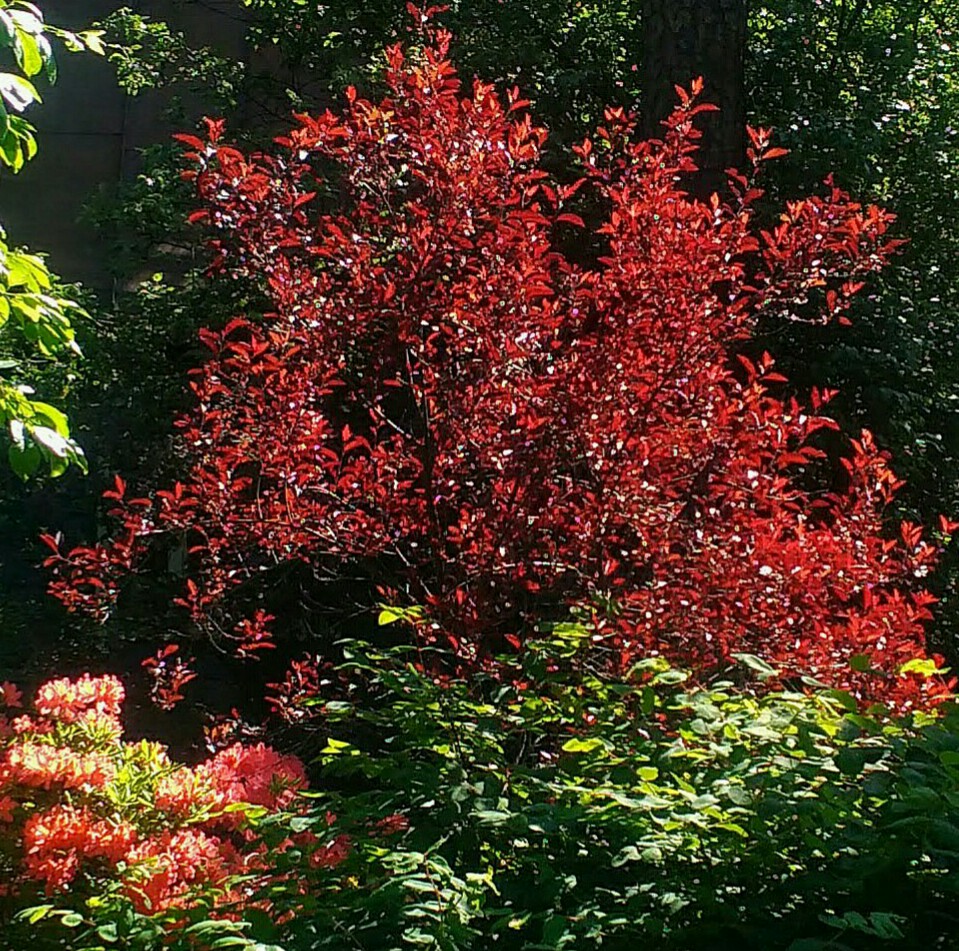 Девочки, недавно нашла эту красивую тему, буду читать и любоваться. Из последнего поразили розы редких цветов, показанные Аманитой. Да, как же быстро летит время. Вот только цвела азалия, а уже все. Зато радуют все лето пестро и яркоцветные кустарники, обожаю их за это. Это декоративная вишня, а внизу азалия