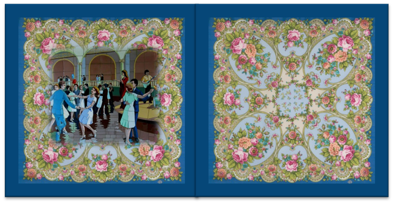 Платки: &quot;Без названия (или АГАШКИ-2)с &quot;хороводами&quot; букетов из <br />крупных розочек-агашек с ромашками.  <br />&quot; и &quot;РУССКАЯ КРАСАВИЦА. <br />Автор Ирина Дадонова. <br />Рисунок 1985 г.,<br />возобновлён с изменениями в 2011 г.