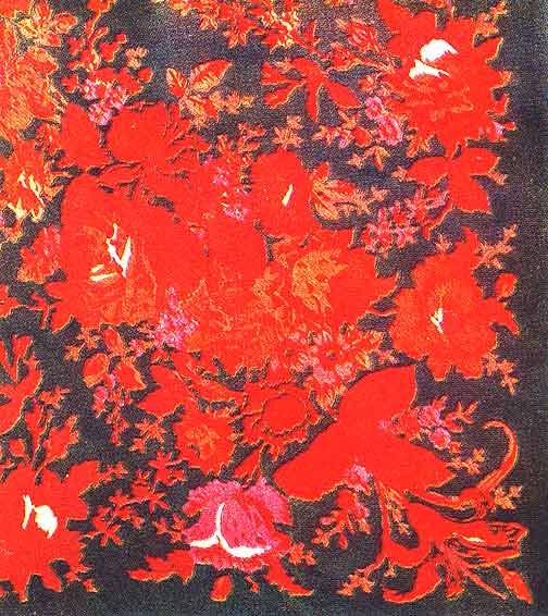 Художник много и часто рисовал с натуры... В Загорском государственном историко-художественном музее хранится его платок "Медальоны". На алом грунте сложная композиция, сделанная из цветочных медальонов, каждый из которых законченное произведение.