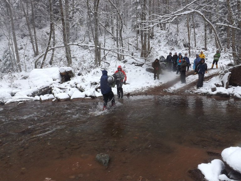Мы доехали до Рожкао на автобусе с командой туристов-школьников, переночевали, а наутро протопали 12 км по дороге до пещеры и поставили там лагерь. Сразу же в тот день организовали спуск. Эти места в ноябре - осенне-зимняя сказка.