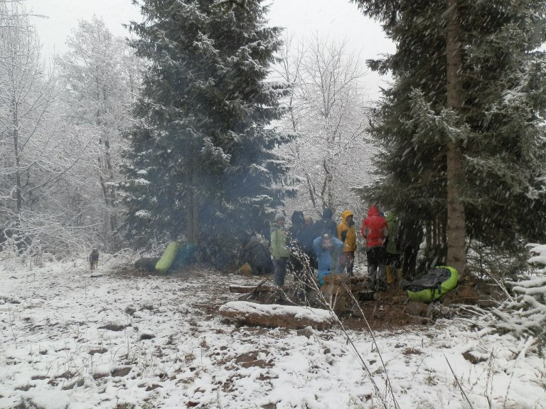 Мы доехали до Рожкао на автобусе с командой туристов-школьников, переночевали, а наутро протопали 12 км по дороге до пещеры и поставили там лагерь. Сразу же в тот день организовали спуск. Эти места в ноябре - осенне-зимняя сказка.