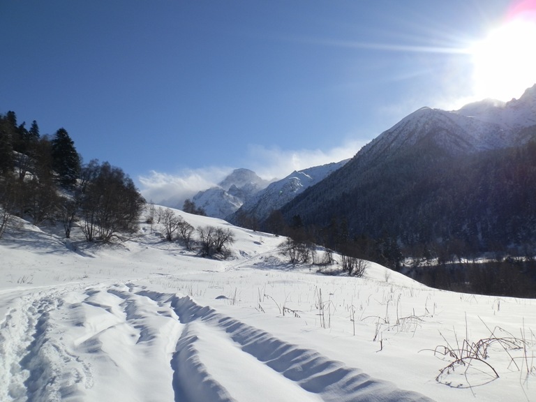 Но все же мы добрались до цели - увидеть замерзшие водопады в верховьях реки София. Долина к ней очень длинная, засыпанная снегом.