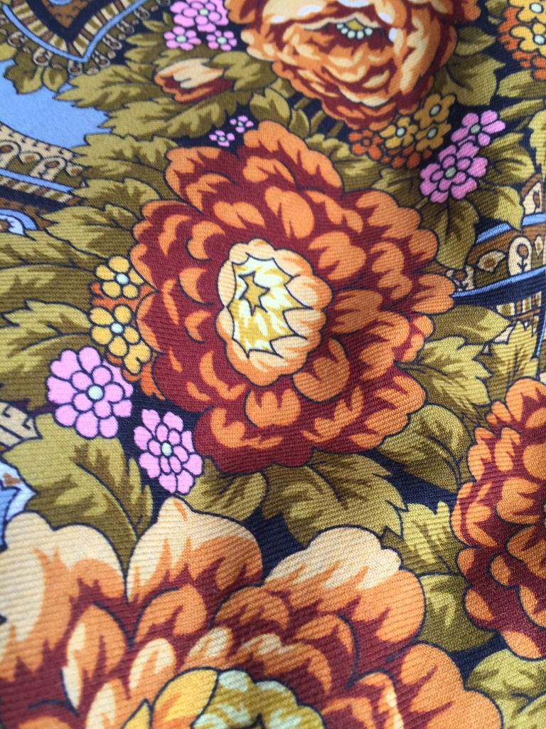 На мой взгляд, Цветочные бусы, как и многие рисунки Е.Жуковой, все же больше органичен в городе. Но платки подбирала к одежде, а не к пейзажам.