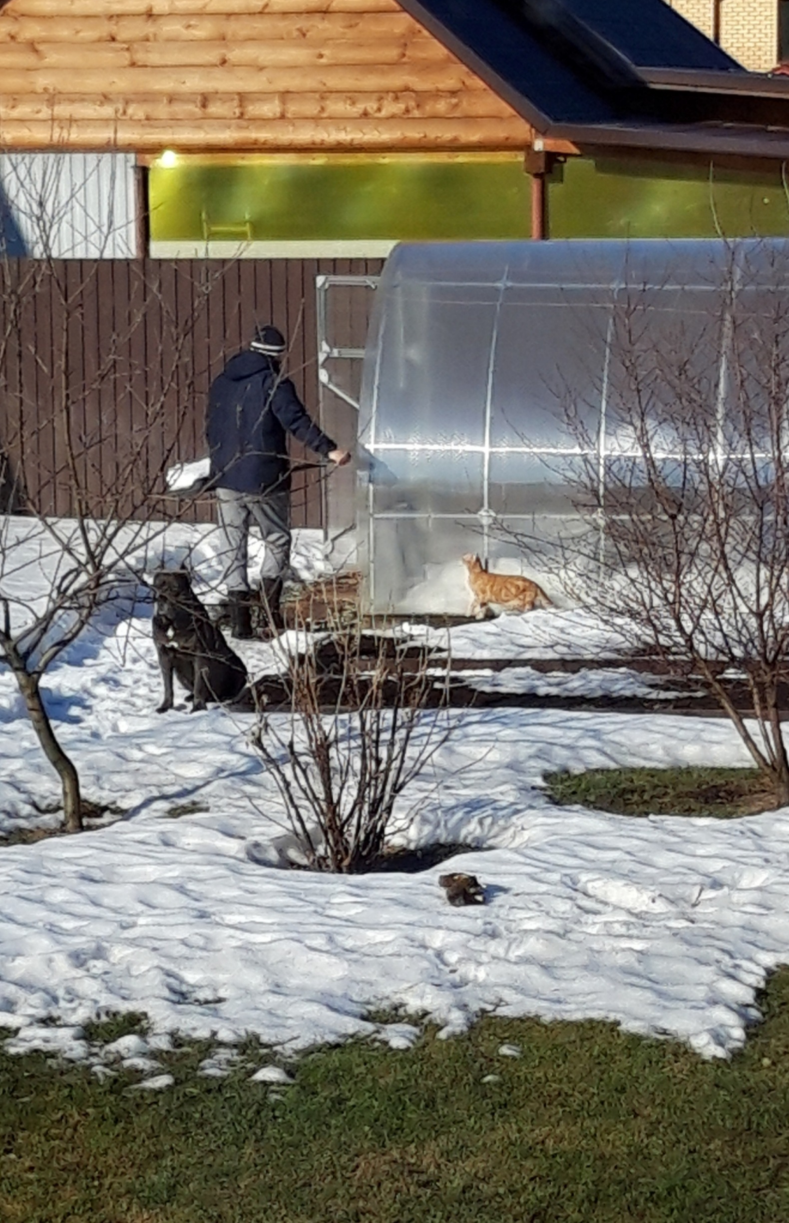 Сегодня утром Борз и Симба помогали хозяину в уборке заталкивании снега в теплицу.