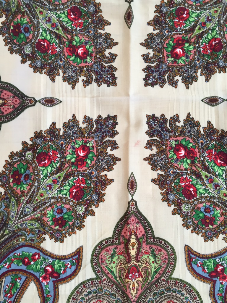 Очень давно хотела эту шаль и горевала что она была снята с производства. Доминирующий лилейный оранжевый цветок--сказочный! И ,кажется, если не ошибаюсь, это единственная шаль , где изображен водосбор (Аквилегия) .Когда то покупала платки для разнообразия гардероба, как аксессуар дополняющий ( или акцентирующий) образ в одежде. Сейчас стараюсь подобрать что то ближе именно к своему цветотипу. В этом случае, говорят , нужно смотреть платки у лица.