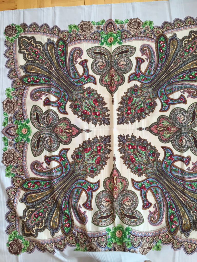 Очень давно хотела эту шаль и горевала что она была снята с производства. Доминирующий лилейный оранжевый цветок--сказочный! И ,кажется, если не ошибаюсь, это единственная шаль , где изображен водосбор (Аквилегия) .Когда то покупала платки для разнообразия гардероба, как аксессуар дополняющий ( или акцентирующий) образ в одежде. Сейчас стараюсь подобрать что то ближе именно к своему цветотипу. В этом случае, говорят , нужно смотреть платки у лица.