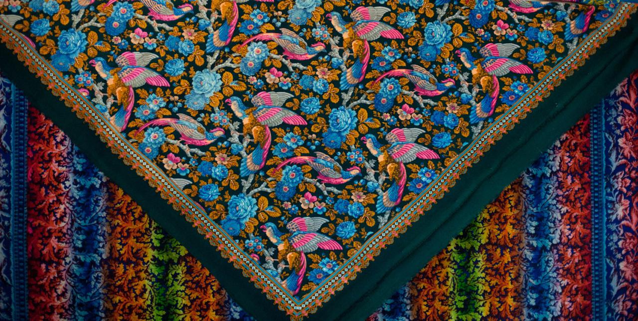 Шали и покрывала, представленные на этом стенде, выполнены на Ленской фабрике. Такое название в 1921 году получила одна из 5 текстильных фабрик Павловского Посада - бывшая фабрика Абрамовых.