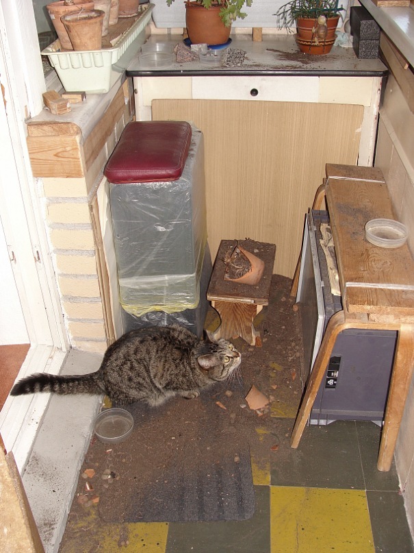 А взгляд-то, вроде как понимает, что гадость сотворил... А не в отместку ли это за изгнание на лоджию?