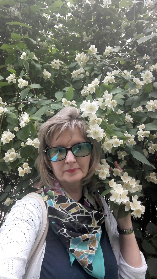 А я сегодня гуляла с крепжожетовым платочком Парк Гуэлъ и сфоткалисъ у куста жасмина, ну тоестъ , вовсе и не жасмин, но красиво цветёт, а как пахнет, мммммм...