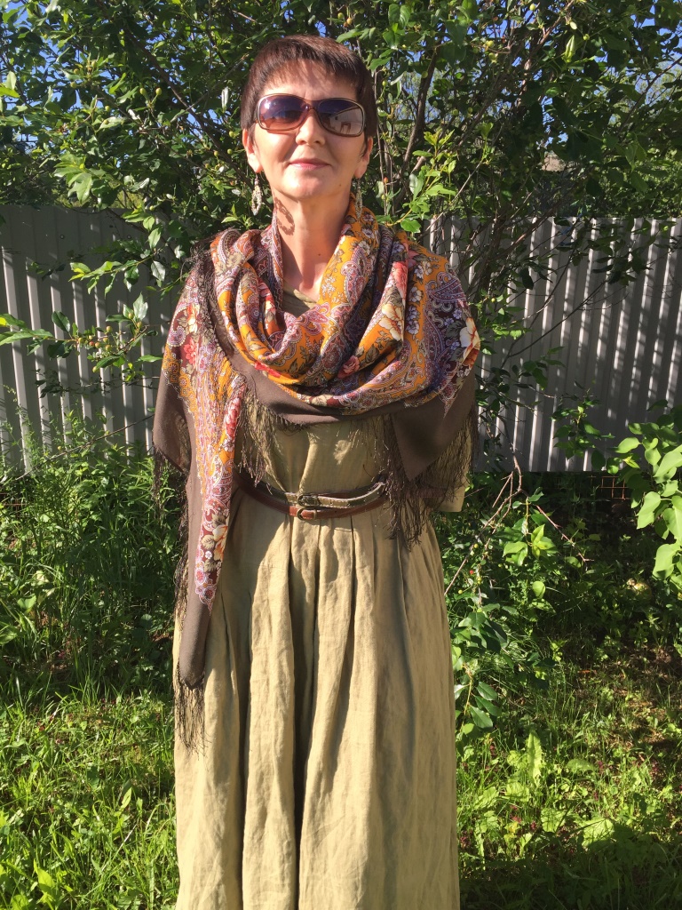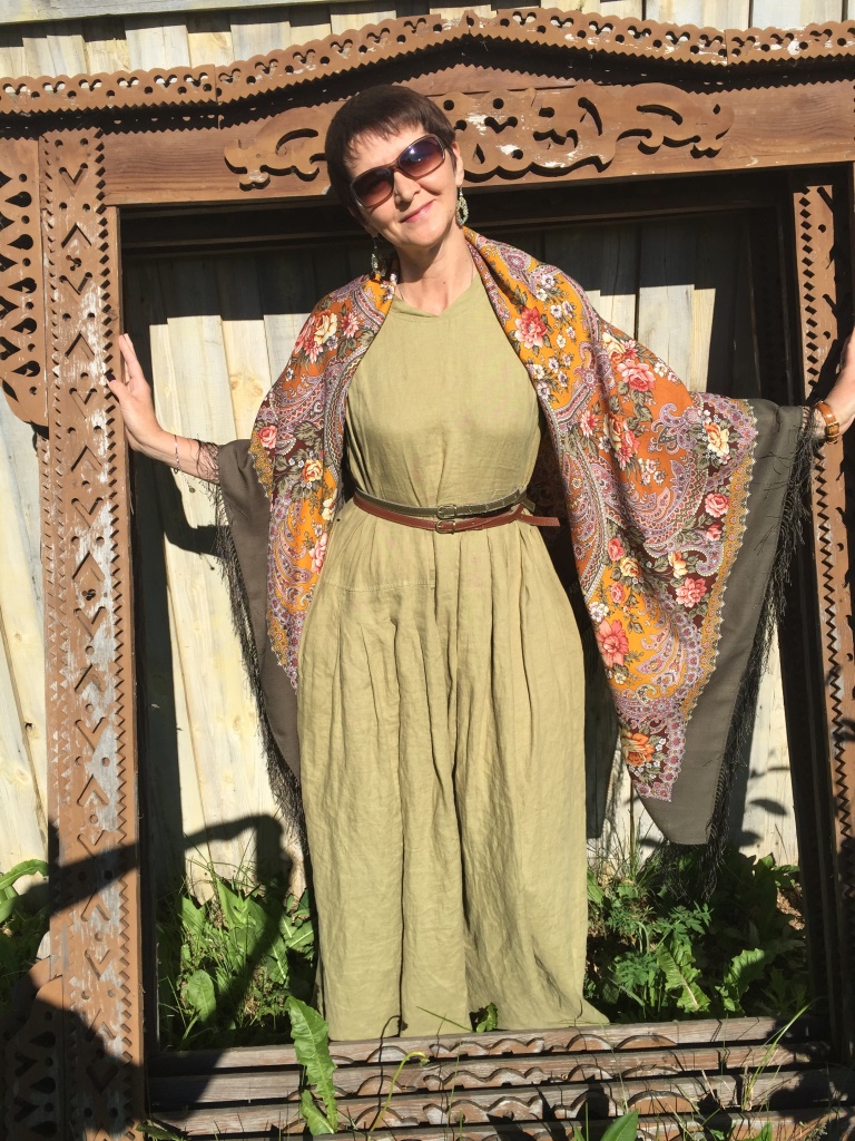 Интересно ложится в драпировку, маки прячутся, получается такой светло-коричневый орнаментальный монохром, весьма изящный. Очень приглянулась мне эта шаль, муж присудил ей 1е место по комплиментарности со мной из этих примерок)