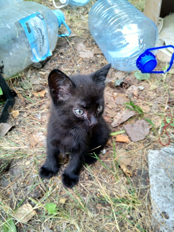 Полностью черный, по-моему мальчик, около месяца, на вид здоров, только блохи...