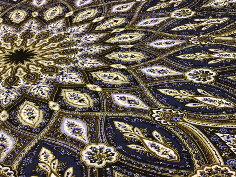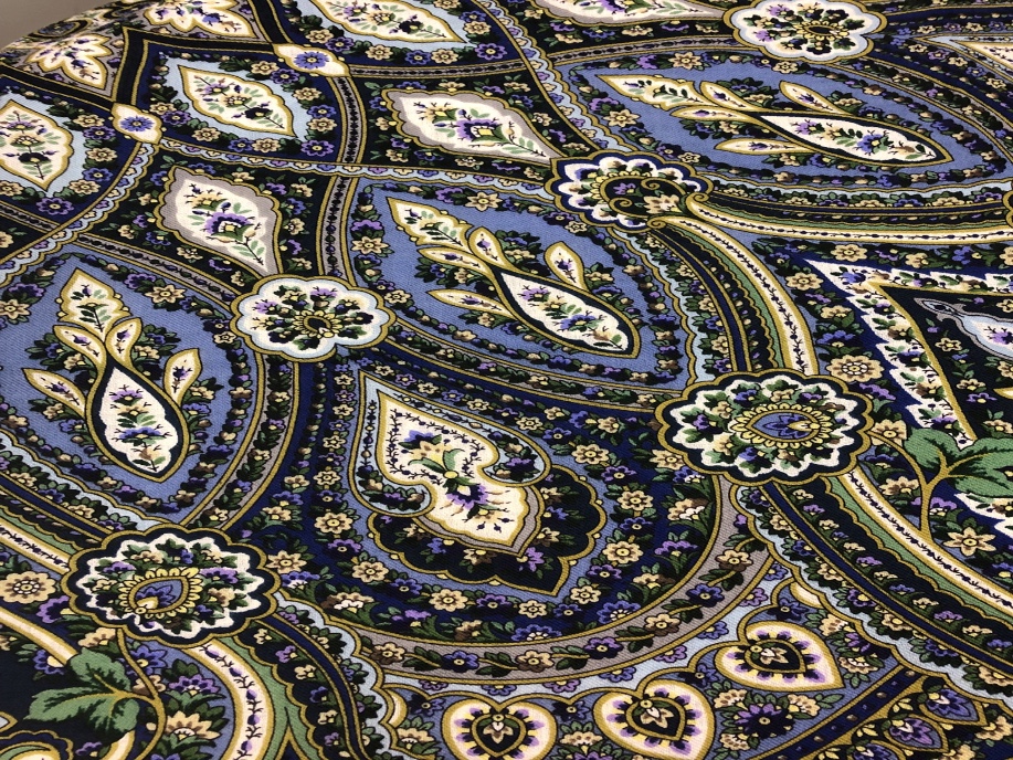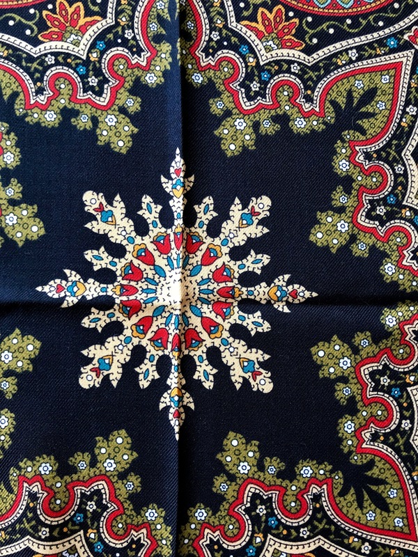 Фон -мягкий черный, при съемке бликует в синий. Краски насыщенные, в целом--платок не темный и не яркий. Цвет, который на мониторе (или фото) кажется красным, на самом деле--темно кирпичный. Зелень --сочная, зеленая оливка, без ухода в желтый. Несколько оттенков натуральной бирюзы.Вообще, все цвета--натуральные, не кричащие, без ядовитости, универсальные. Ткань средней плотности, показалась более легкой, чем обычно, но совсем тонкой назвать не могу.
