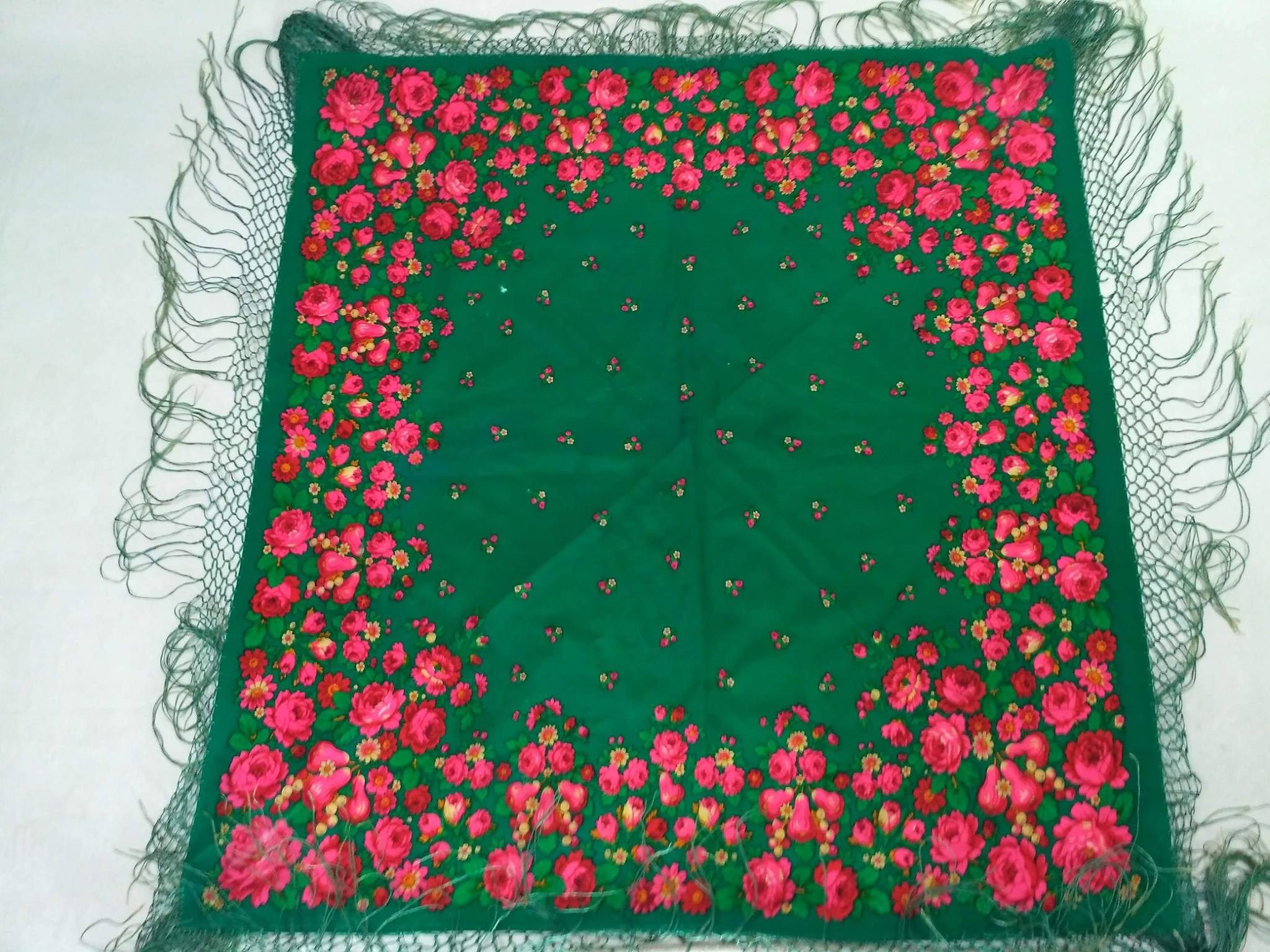 Старинный платок зеленой шерсти, набойка цветами, снова из Альканьиса