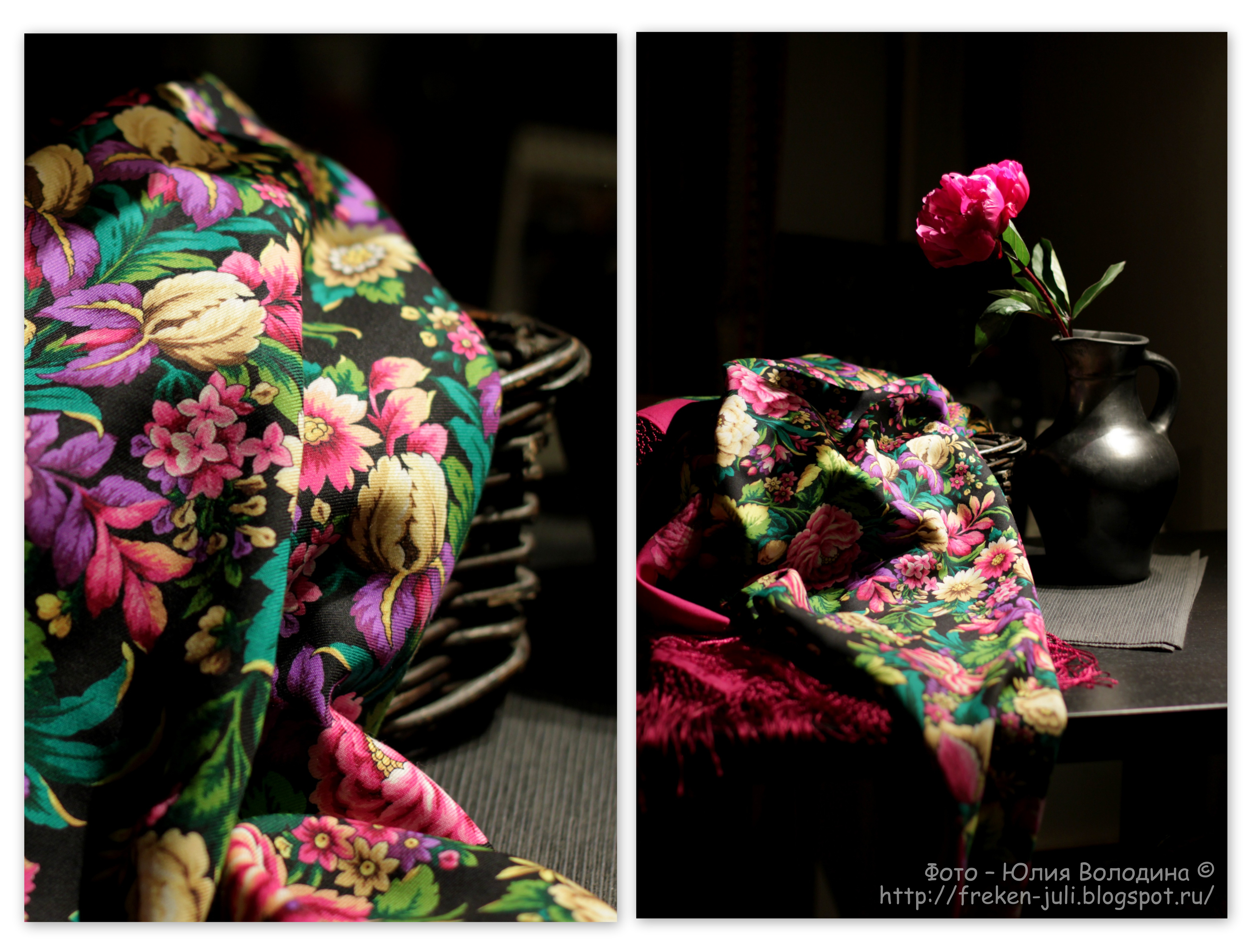 В сущности, то же самое я вижу и в новой шали - Павловопосадский. Мы её еще мало обсудили, а напрасно. Шаль достойна внимания! Как и предыдущие шали из цветочной линии Валерии Фадеевой. Я очень жду следующие колориты, а пока, тот что уже имеется, просто завораживает цветовой гаммой! Шаль удивительно красива имено по цвету. Вроде простое и довольно избитое сочетание - голубой+розовый, но всё дело в оттенках этих голубого и розового. В тех оттенках, что мы видим, шаль не смотрится простецкой. Она смотрится воздушно нарядной, легкой, летней, будящей фантазию, или воспоминания. И, конечно, цветовой гамме шали добавляет изыска и стиля эта прекрасная сливочная кайма и бахрома. Ну и как всегда - все дело в пропорции распределения цветов. В данном случае, пропорции безупречны. Я совсем не уверена, что хочу иметь эту шаль, но то, что она красива, это безусловно!