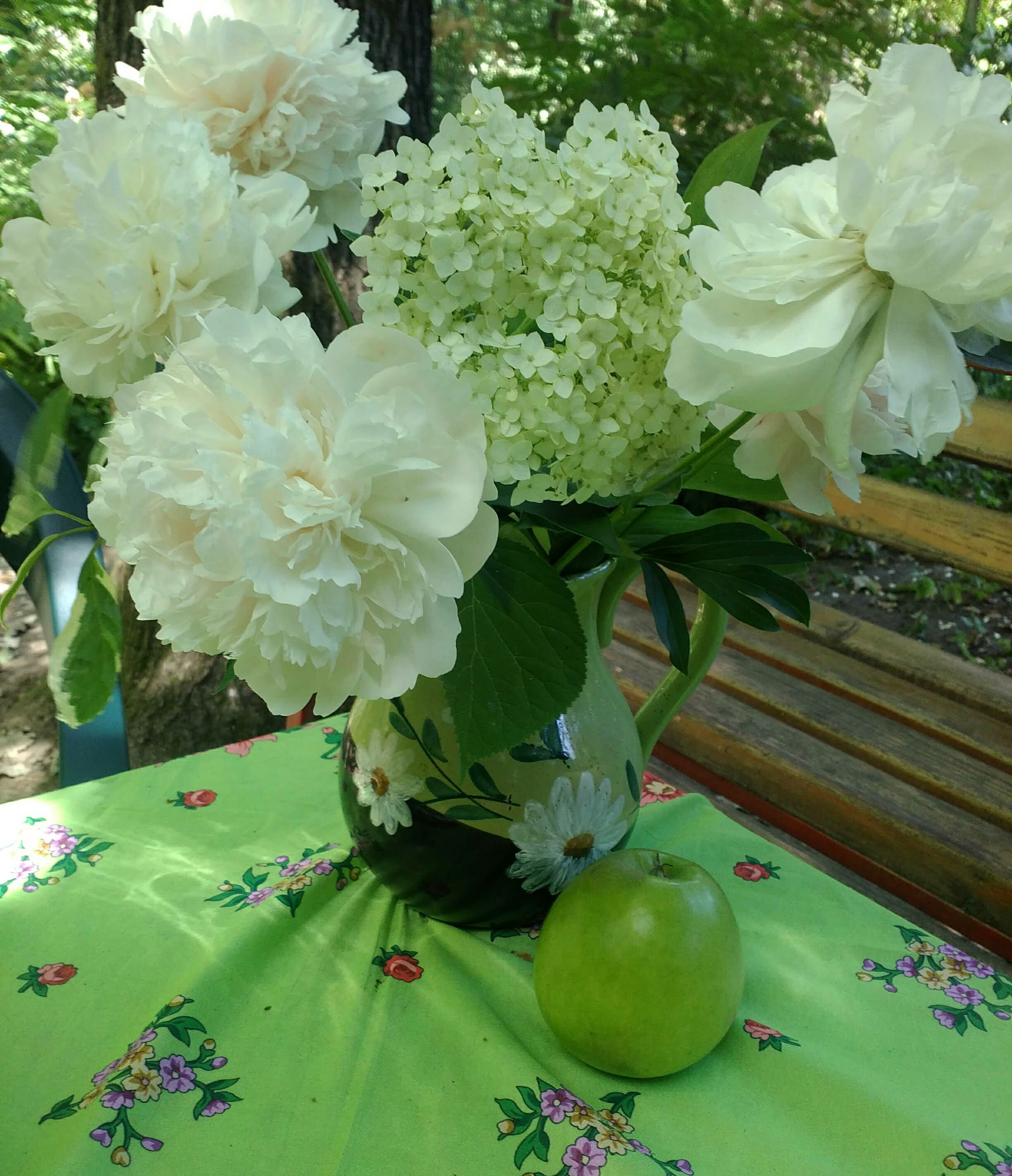 , капля солнечного меда - это красиво, а картинки ваши подождем. А я, как обещала, с самоваром. Последние пионы и первая гортензия. Шаль х/б Цветочное ожерелье И. Дадоновой