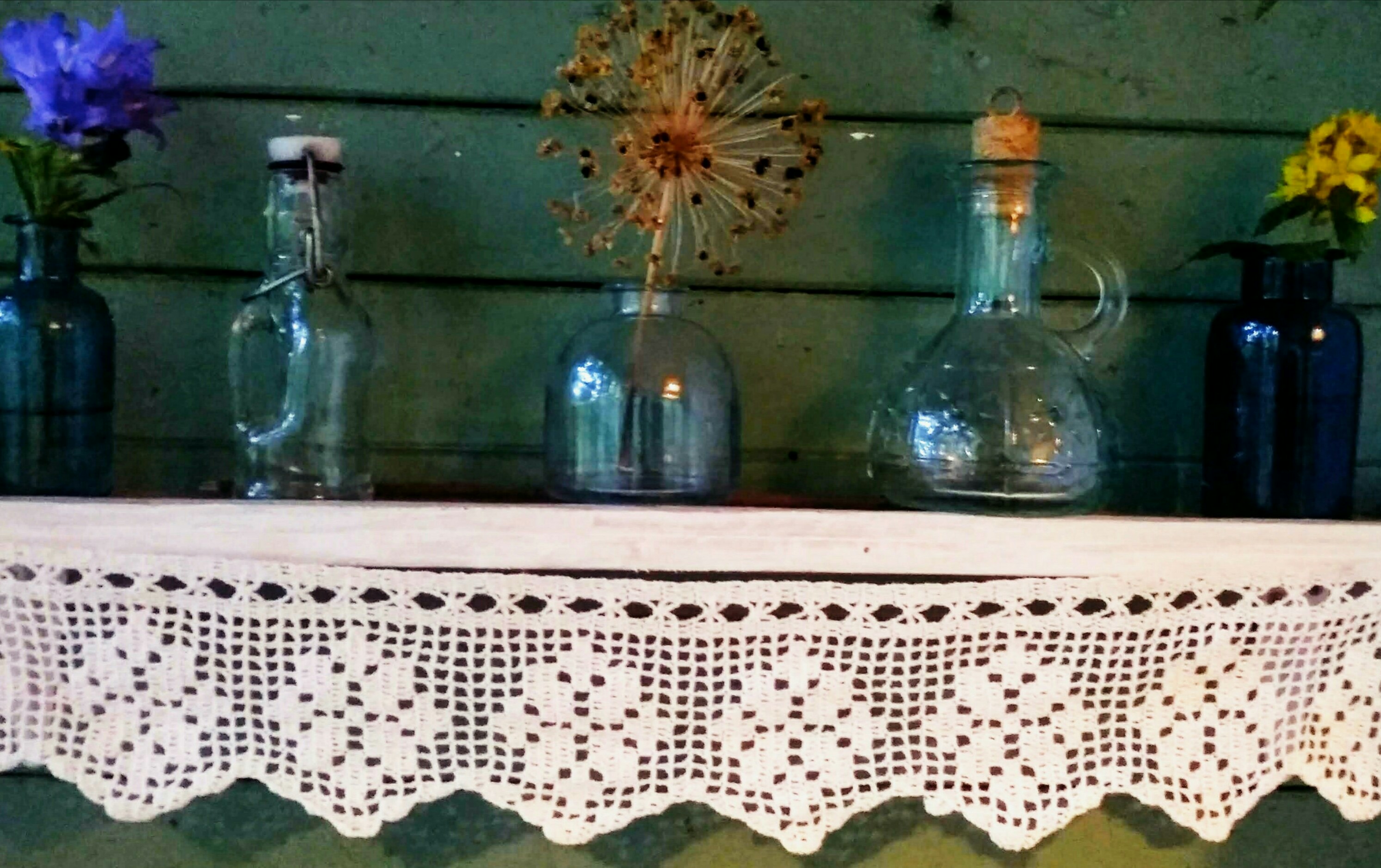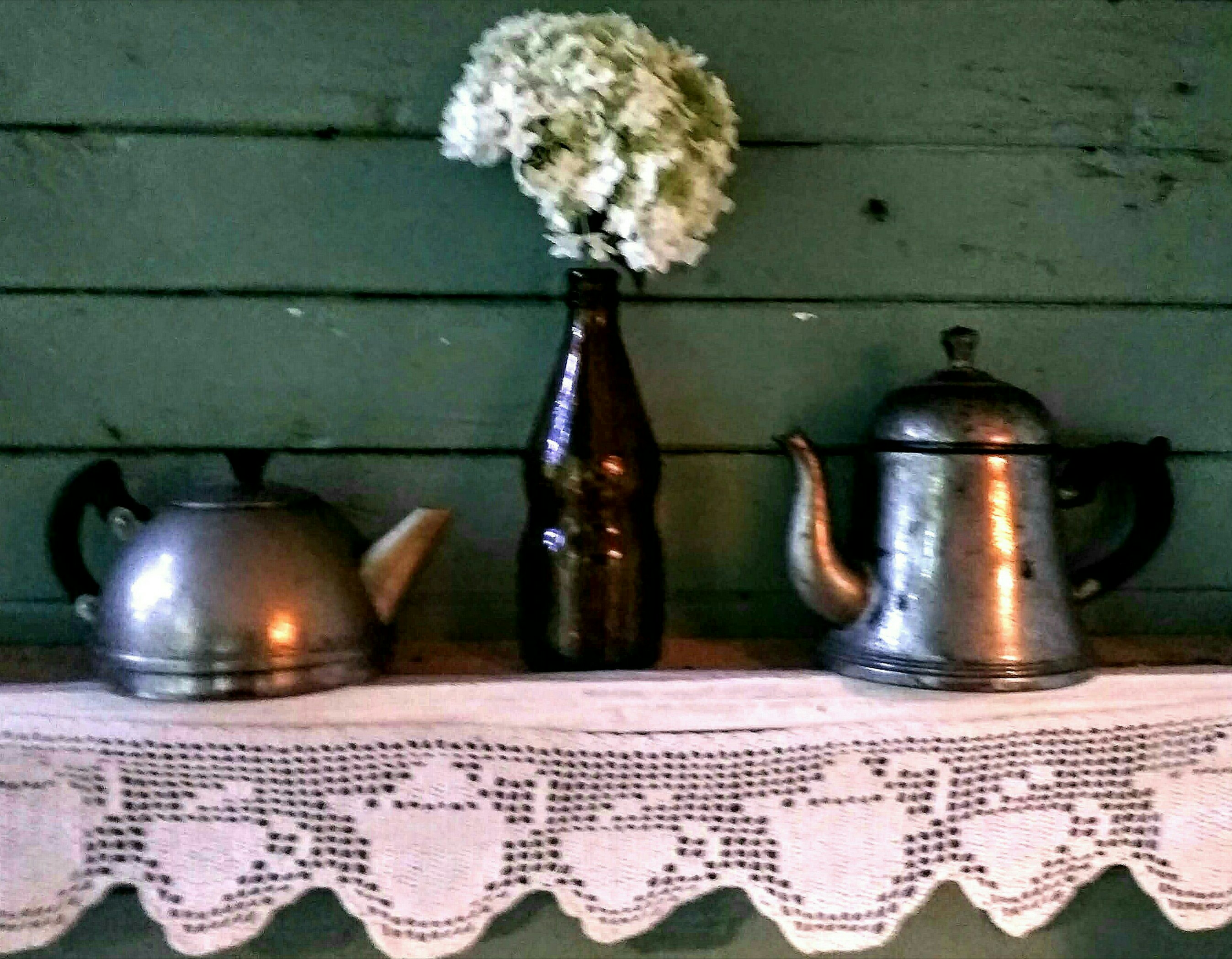 И вдогонку пару натюрмортов, не строго по теме, заранее извиняюсь. Маленькие стеклянные бутылочки с кружевом про цветы. И старые чайники заварные металлические с кружевом про чайники...