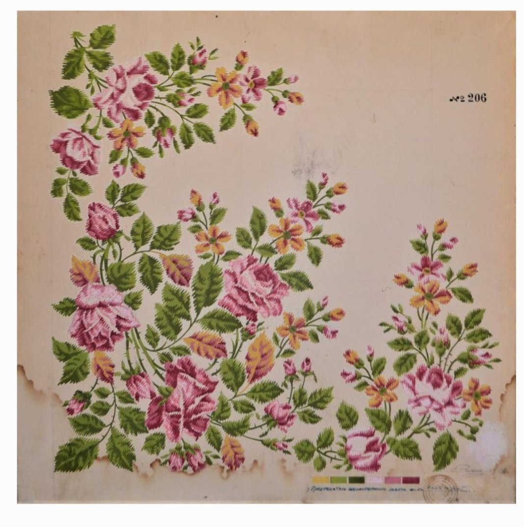 Эскиз рисунка составлен на черном фоне из ярких розовых пионов и сгруппированных мелких сиреневых цветов, дополненных желтыми лютиками. Особенно выделена угловая часть. Центральное поле заполнено вразброс из отдельных цветков и маленьких цветочных композиций.