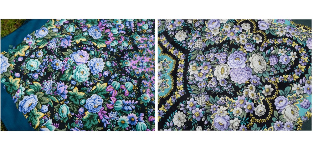 Сравниваю новиночку Павловопосадский-9 с условно похожими бирюзово-серыми шалями Валерии Фадеевой.