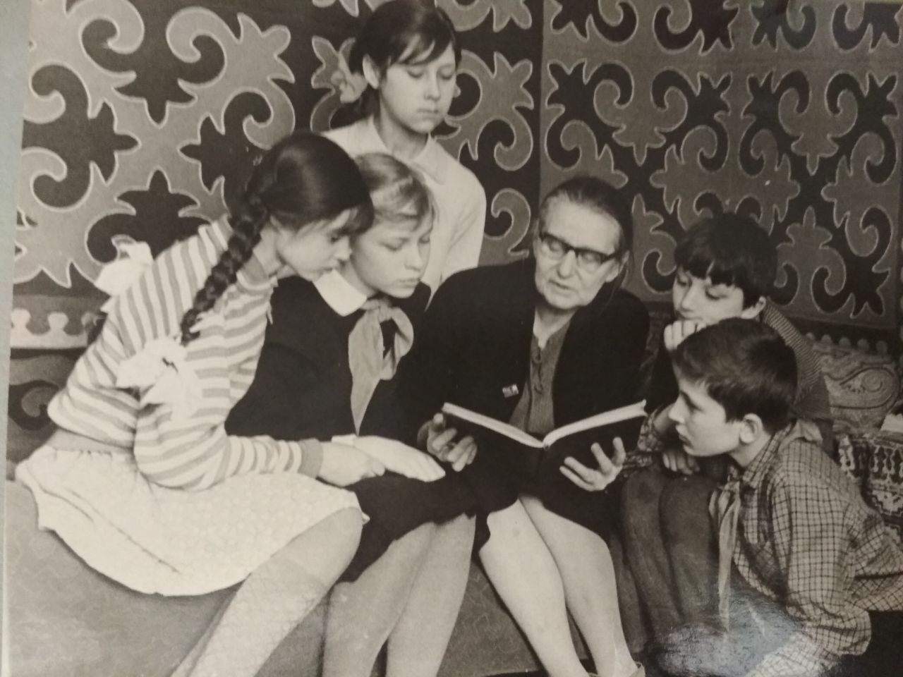 На этой фотографии Лидия Сергеевна Шаховская вместе со Златой Ольшевской и своими воспитанниками - участниками драмкружка