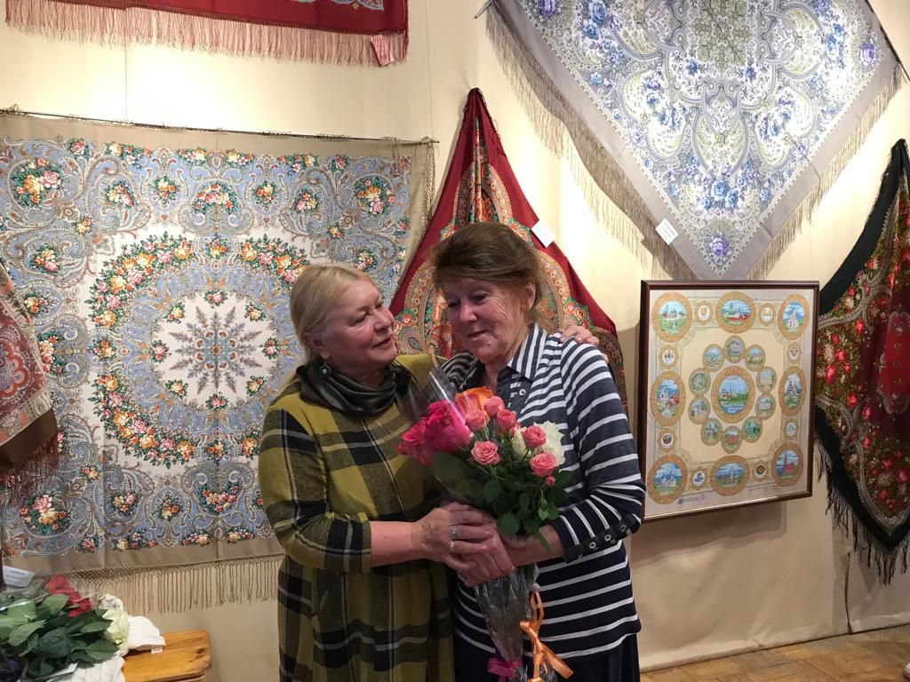 Наталья Белокур была в потрясающем платье и очень красивая. На выставку приехали художники из Гжели, и одна дама просто не могла оторваться от платка «крымская весна».