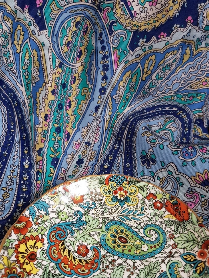 Я предполагала, что эта чайная пара из ранних 60-х гг: возвращение моды на пейсли и характерная стилизация узора. Но клеймо более раннего периода: 1938-1957 гг. да и особенности формы чашки, а также качества фарфора - сороковые-пятидесятые.