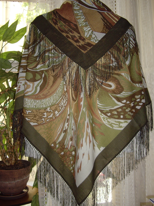 Сначала платок, что доставил самые большие эмоции (причем неожиданно). Речь о " Тайна джунглей" (89*89). Жутко обрадовало сочетания всяких болотных оттенков, очень подходящим оказался. Он не захотел складывать пополам - рисунок напрочь терялся. В результате открылся в сложении одного угла к середине. Так я его со всех сторон и нафотографировала. Для лета очень неплохой вариант - так получается небольшая шаль в одно сложение.
