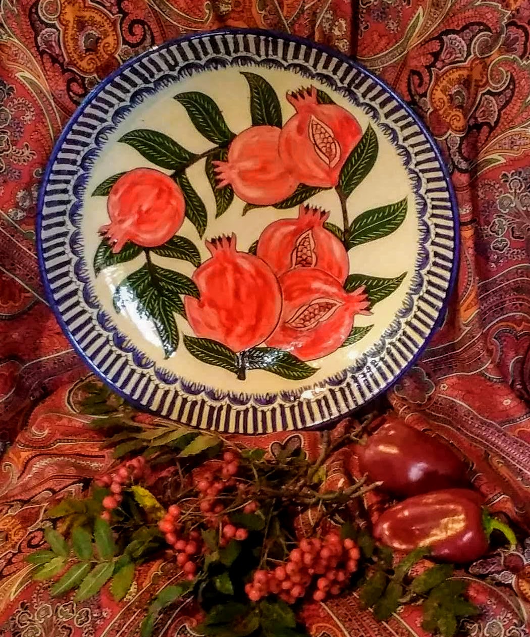 ELEN_A, Лена, рассказываю: запала в душу ваша рыже-лепестковая тарелка, полезла в инет искать похожую, не нашла, нашла непохожую, понравилась, купила, показываю (а рыжую все равно хочу!). При нашей "полгодазиме" такие вещи нужны! Риштанская керамика, серия Гранаты (свет плоховатый)