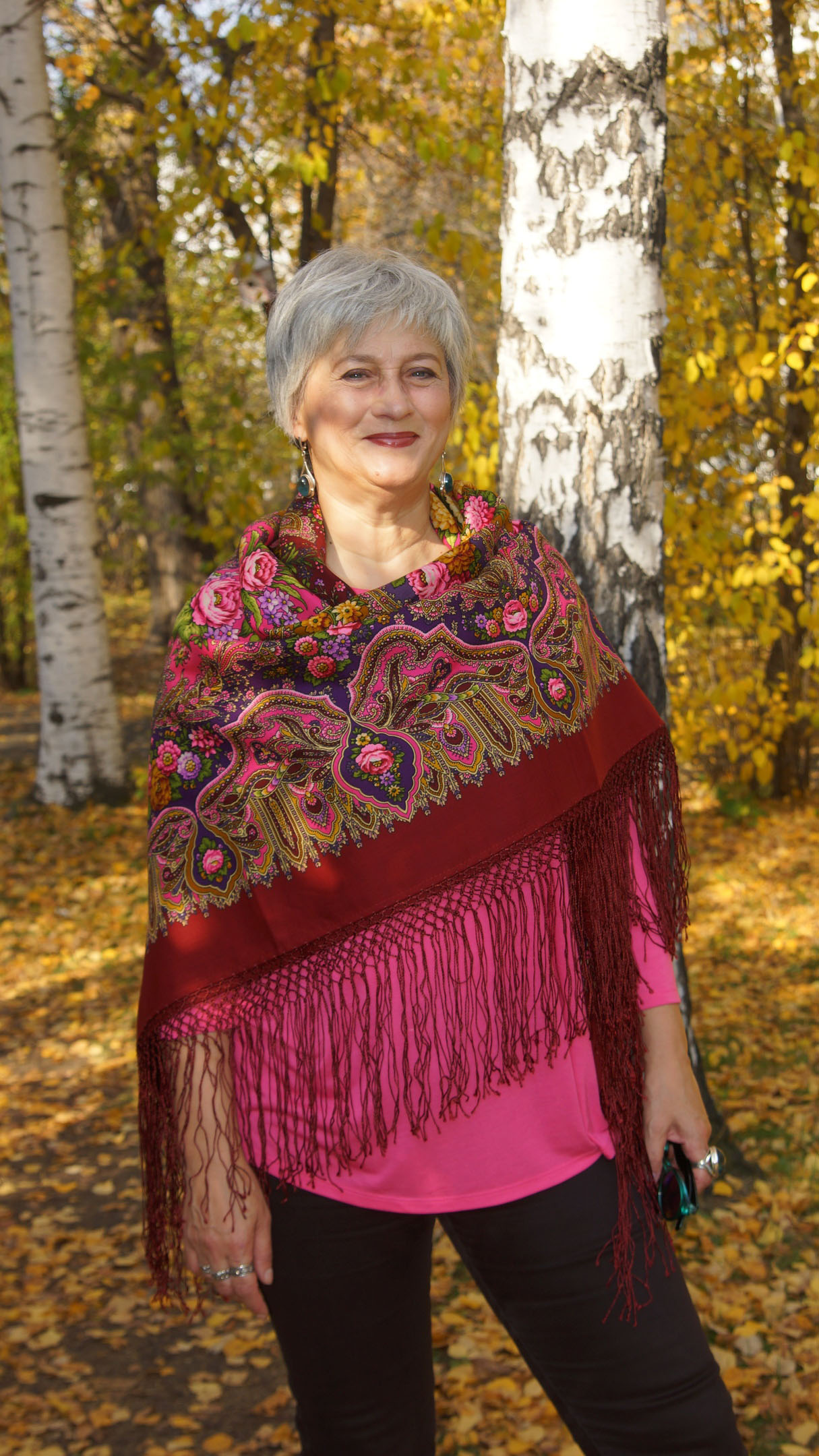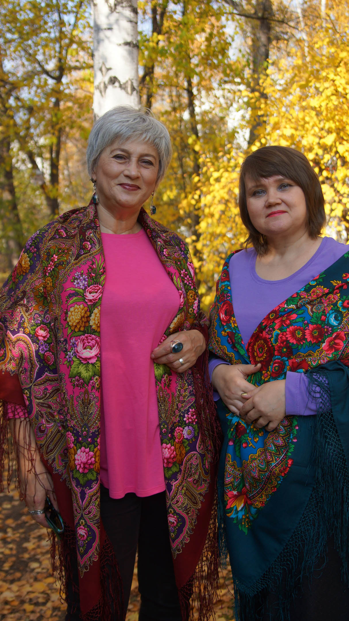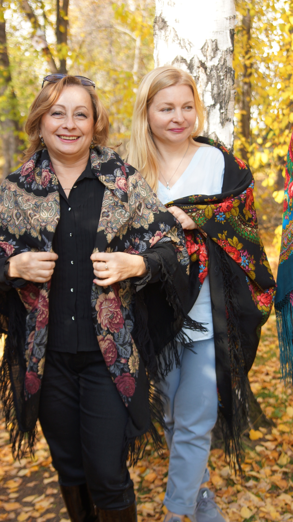 И платки играют красками, и глаза у нас блестят. Все прохожие на наши шали засматривались. Наталья, Надежда и Светлана.