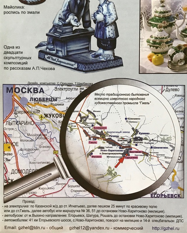 "Гжель-крупнейший гончарный регион, возникший в 50-верстах к юго-востоку от Москвы и включивший почти 30 сел и деревень. Впервые упоминается в XIV веке в Духовной грамоте (завещании) Великого князя Московского Ивана Калиты. Слава пришла к Гжели в XVIII веке, когда было освоено производство майолики (разновидность керамики).Майолику изготавливали из цветной глины, покрывали оловянной глазурью, непрозрачный слой которой, служил фоном для росписи: по белому полю эмали наносили цветные пигменты. Русское название майолики--ЦЕНИНА, от немецкого Zinn--олово, которое входило в состав эмали.
