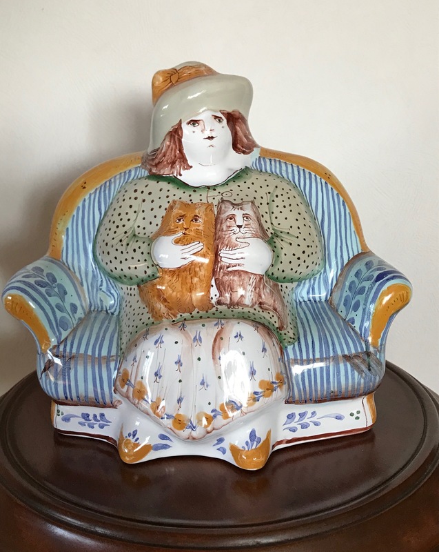 Для сравнения, покажу подсвечник периода 90-х, ( который демонстрирует моя кошка Зося) и сравнительно недавно ( 2017 г) приобретенную майолику в изделиях мелкой пластики, молодых художников Гжельского завода. Традиции росписи сохранены.