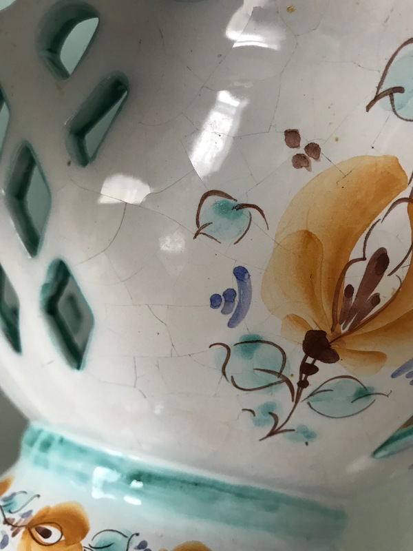 Нашла еще вчера Вазу для фруктов. Примерно, где то 1995 год. Одно время активно пользовалась ею по назначению и приходилось мыть часто. В результате , со временем ( через 10 лет) пошли трещины по эмали и кое- где крошка. Если майолику брать, то лучше что то интерьерное.