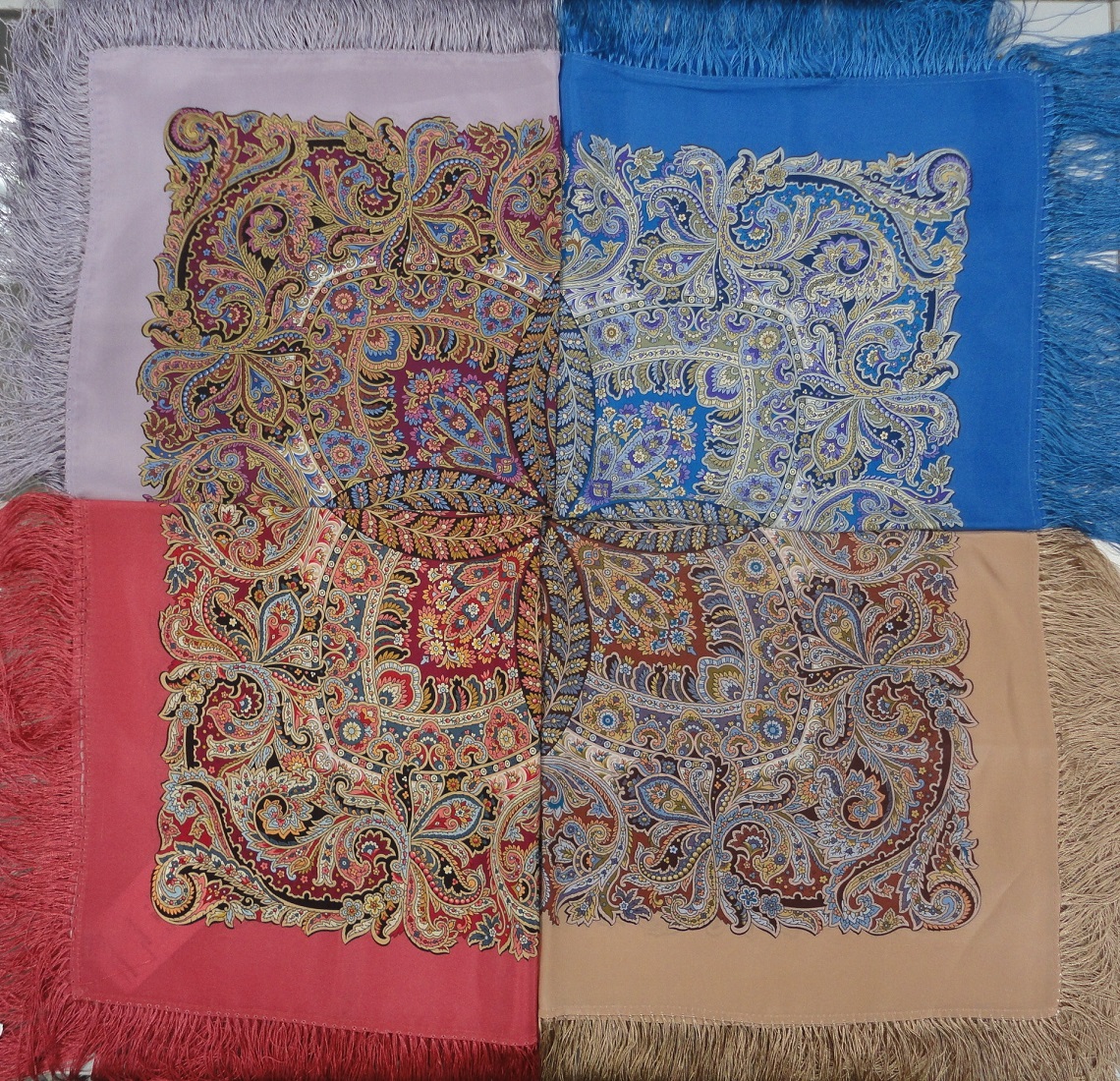 Платок шелковый (крепдешин, бахрома) "Великолепный век", вид 15,13,3,16, 130х130 см