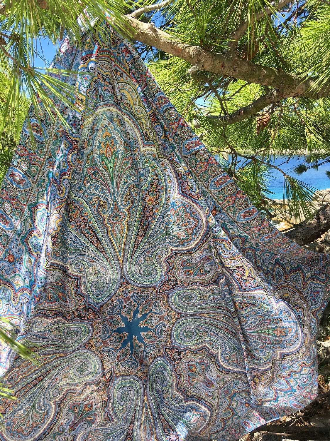Рисунок очень красивый, а формат хлопковой шали я так и не поняла. В холода под верхнюю одежду – громоздко, летом – жарко, драпируется плохо, намотка на шее топорщится несуразным кулем. Да еще зигзаг ненавистный, после нескольких стирок вид стал совсем ужасный.