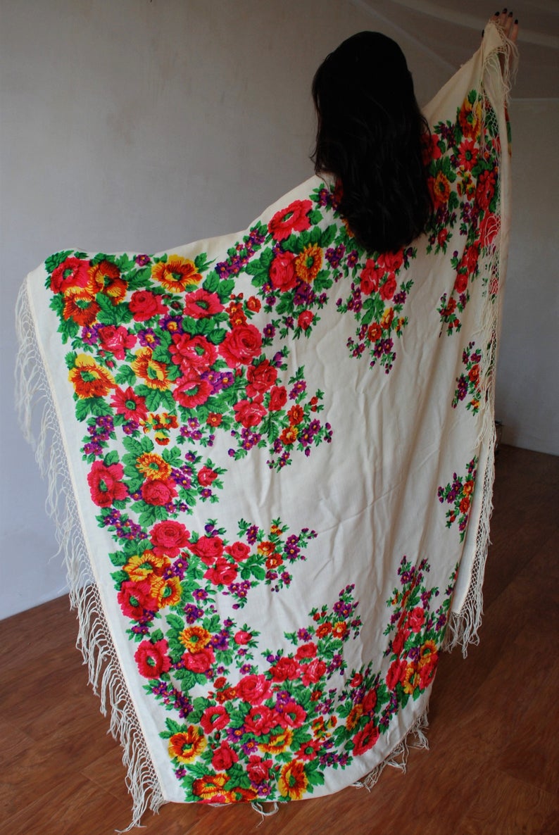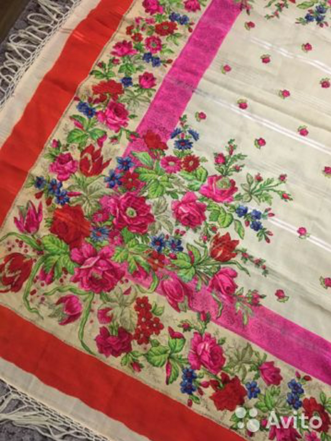 На просторах интернет сообщества нашла шаль Белый розы. Мне как дилетанту показалась ручная набойка. Сомневаюсь . так как Елена Владимировна как то писала что ее никто не видел. Посмотрите ошибаюсь ли я?