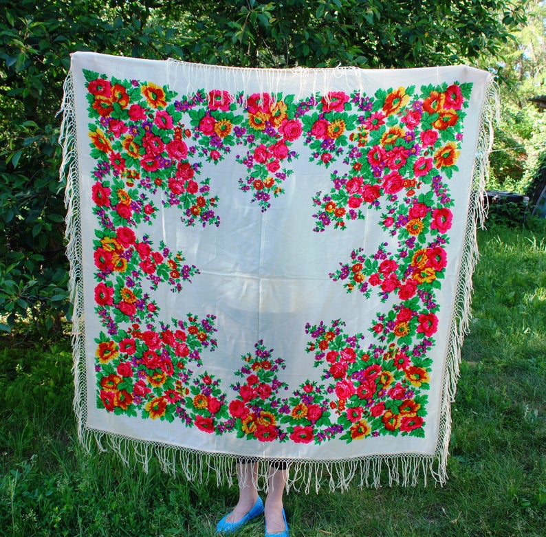 На просторах интернет сообщества нашла шаль Белый розы. Мне как дилетанту показалась ручная набойка. Сомневаюсь . так как Елена Владимировна как то писала что ее никто не видел. Посмотрите ошибаюсь ли я?