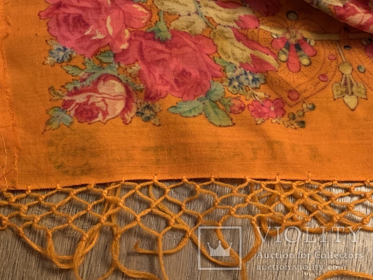 Шаль 150х150, ручная набойка на хлопковой ткани, бахрома шерстяная