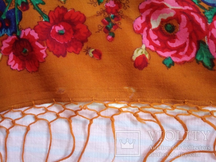 Шаль 150х150, ручная набойка на хлопковой ткани, бахрома шерстяная